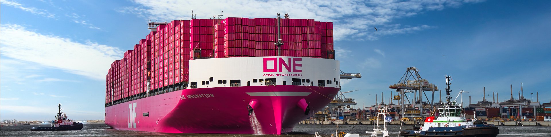 A massive magenta ONE container ship, fully laden with cargo, is being maneuvered by tugboats in a busy port under a blue sky. Photo courtesy Ocean Network Express